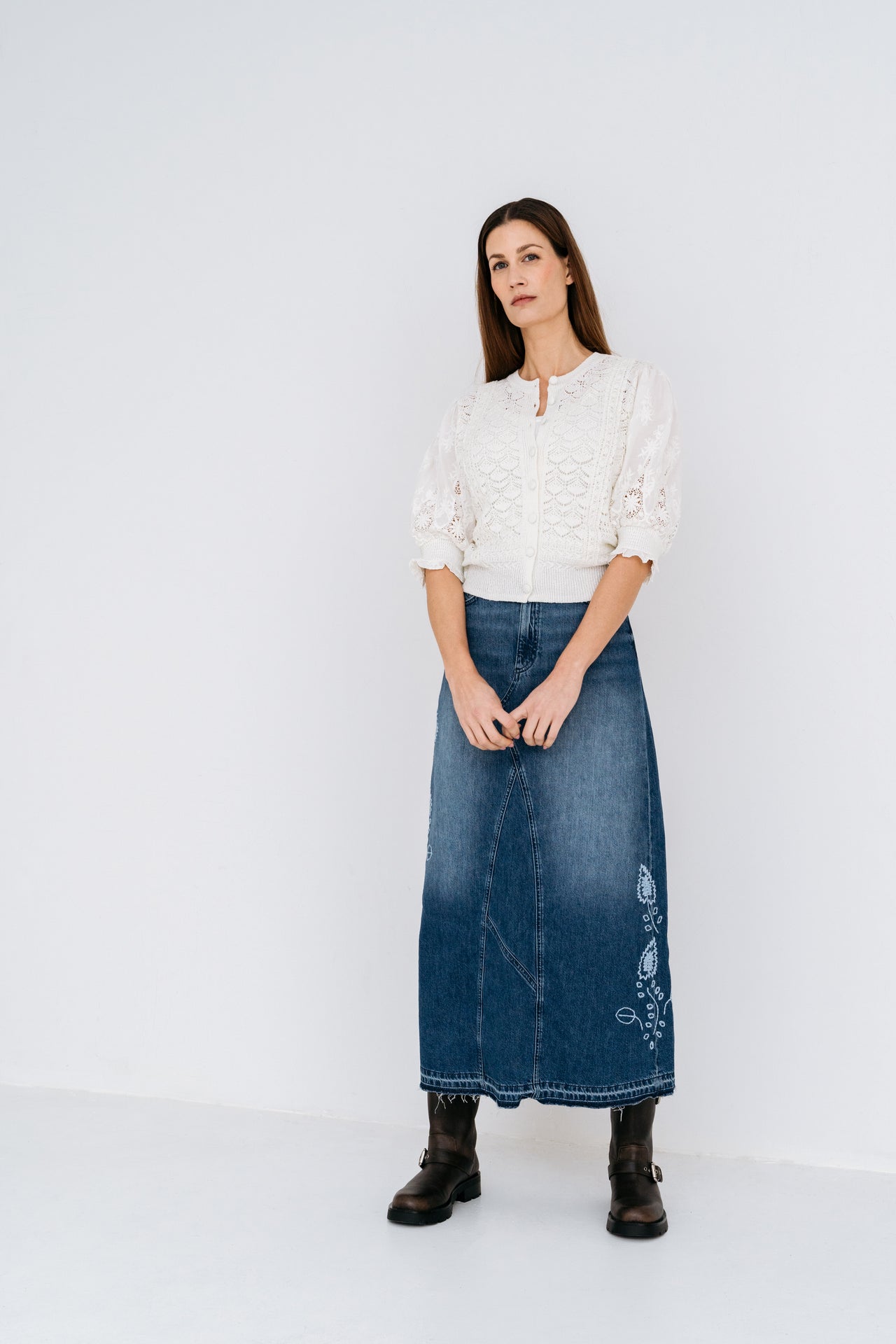 Upgrade je denim collectie met deze prachtige 5-pocket lange Elvis rok. Met oog voor detail vervaardigd, heeft het een slanke split aan de achterkant voor extra allure en bewegingsvrijheid. Het zijpaneel is versierd met intrigerend borduurwerk, wat een vleugje kunstzinnigheid en persoonlijkheid aan het stuk toevoegt. Of je nu door de straten van de stad wandelt of een informele bijeenkomst bijwoont, deze rok combineert moeiteloos stijl en veelzijdigheid. Draag het met een ingestopte blouse en hakken voor een chique dagelijkse look, of kies voor een casual uitstraling met een grafisch T-shirt en sneakers.