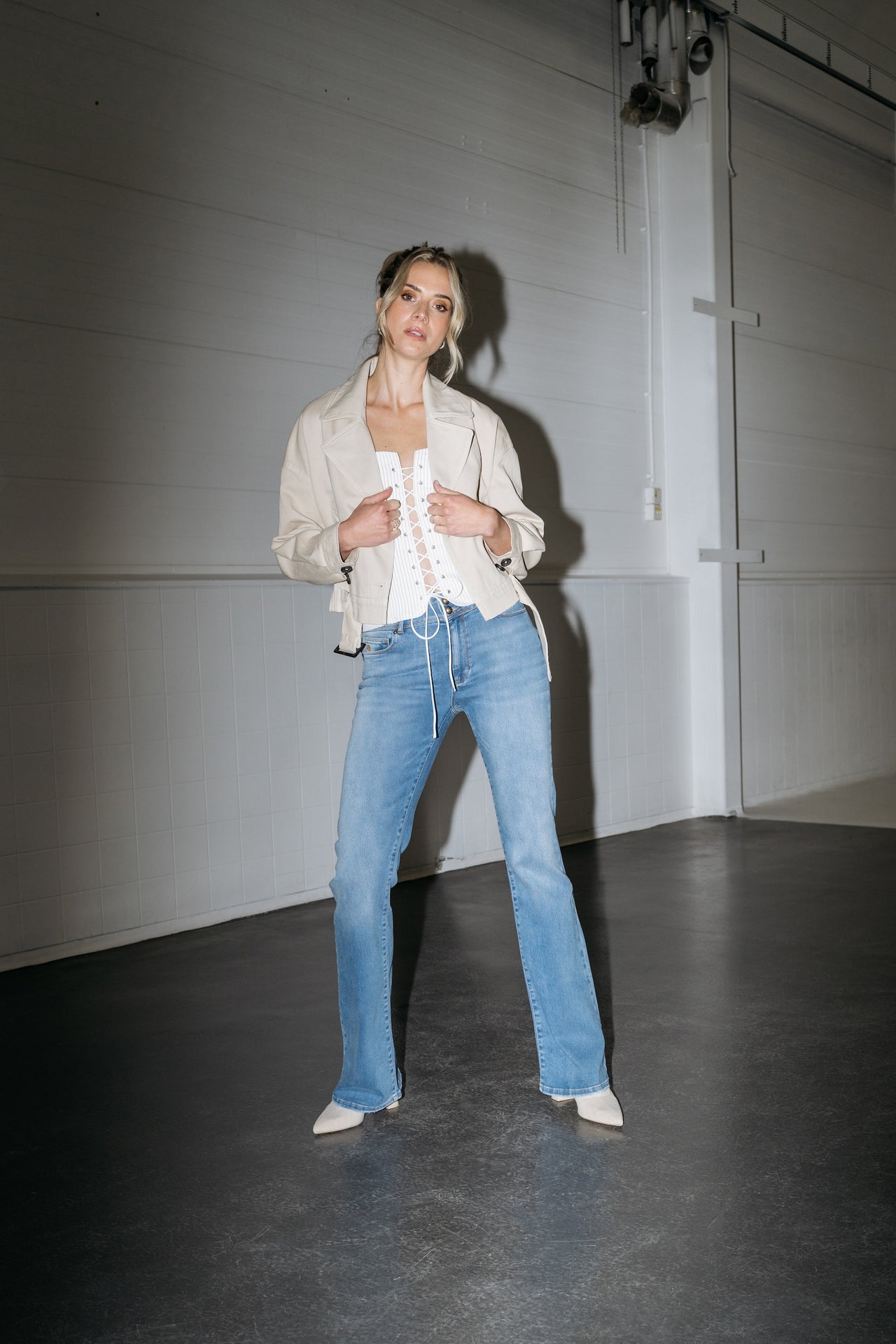REGULAR FIT FLARED LEG 5-POCKET JEANS WITH FLAP BACK POCKETS