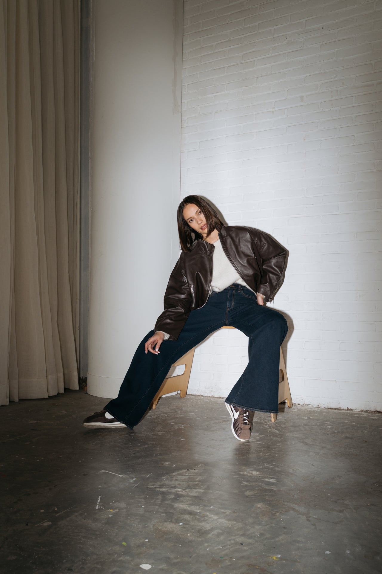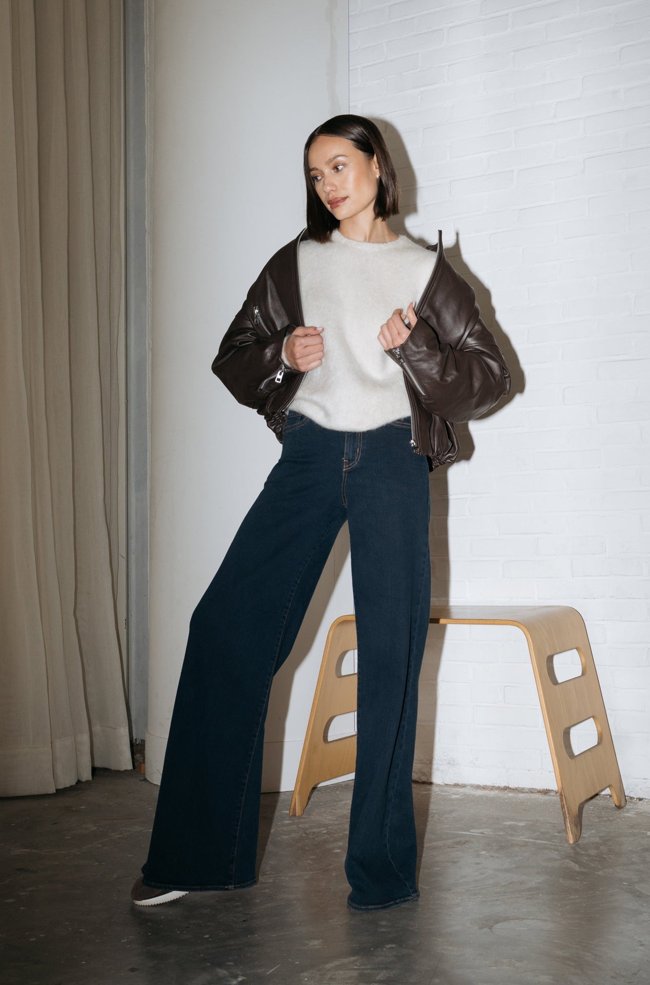 5 POCKET PALAZZO HIGH WAIST FITTED WIDE LEG WITH A BOOTCUT LEG. FABRIC IS POWER STRETCH PREMIUM DENIM WITH MODAL.