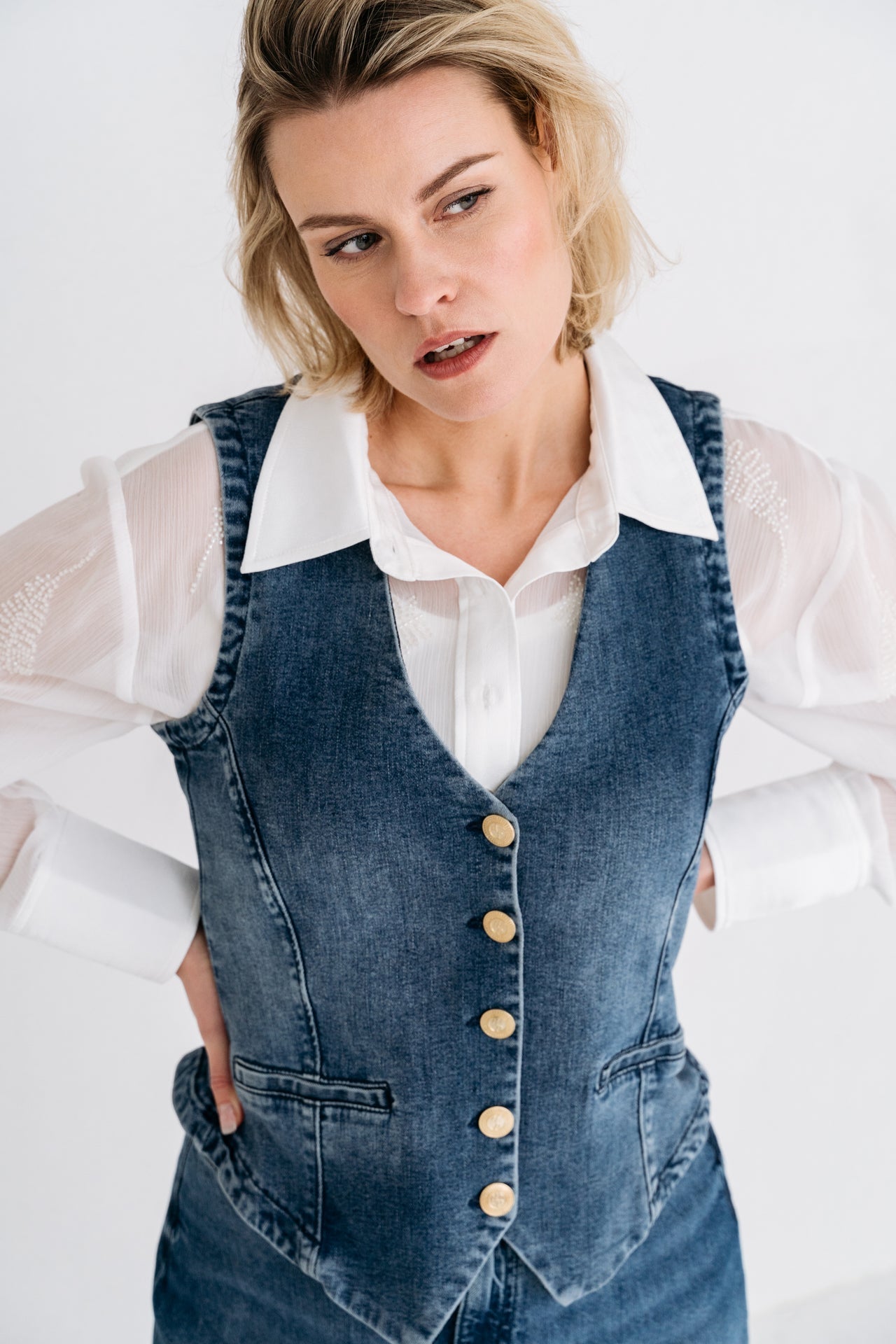 Ontdek de Grace gilet gemaakt van denim stof. Dit veelzijdige kledingstuk voegt een vleugje casual-cool toe aan elke outfit. Het denim materiaal biedt duurzaamheid en comfort, terwijl het mouwloze ontwerp zorgt voor een luchtige en relaxte uitstraling. Draag dit vest over een T-shirt voor een casual look of combineer het met een blouse voor een meer geklede stijl. Een perfecte aanvulling op je garderobe voor zowel dagelijkse bezigheden als informele gelegenheden.